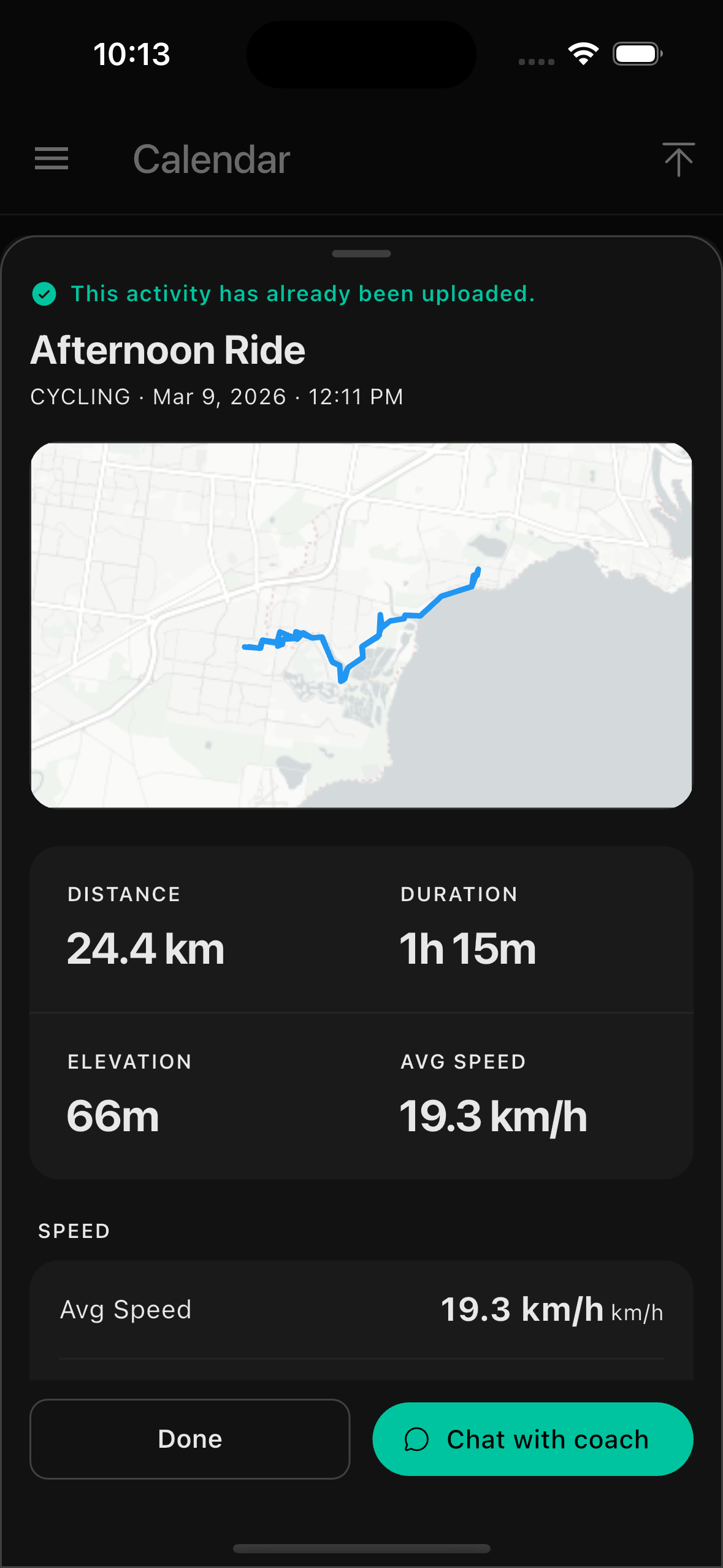 Your activity will be processed and added to your history. Your AI coach can now provide personalised feedback on this ride.